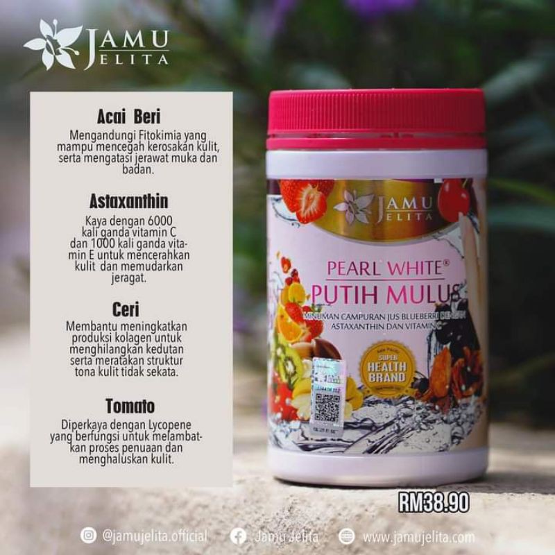 It is also the first company in Malaysia recognised by SUPER BRAND HEALTH of Asia Pacific. HARGA PEARL WHITE PUTIH MULUS MURAH RM45 FREE POS SM. Diformulasikan dengan kolagen yang telah dihidrolisiskan ceri Acerola ekstrak tomato dan kulit kayu Pine yang mempunyai pelbagai khasiat Pearl White Putih Mulus keluaran Jamu Jelita ini efektif untuk mencerah dan menganjalkan kulit wajah.